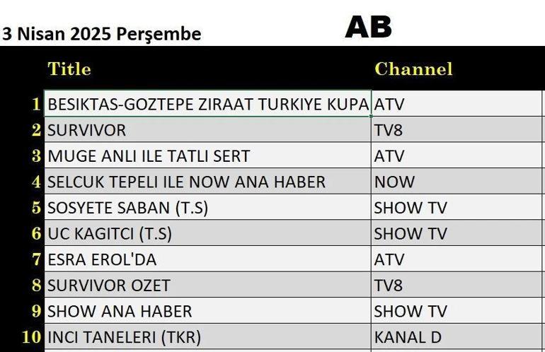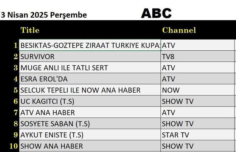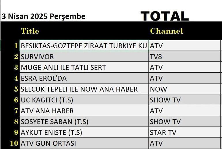 3 Nisan Perşembe değerlendirilmesinin sonuçları açıklandı. 3 Nisan Perşembe günü değerlendirilmesinin sonuçlarına göre ATV’de yayınlanan Besiktas Görtepe maçı tüm kategorilere ilk geldi.