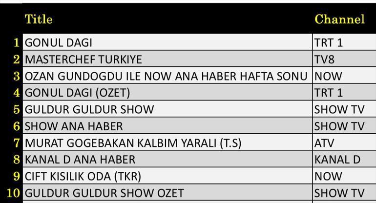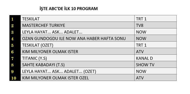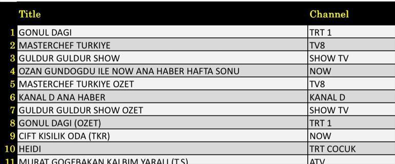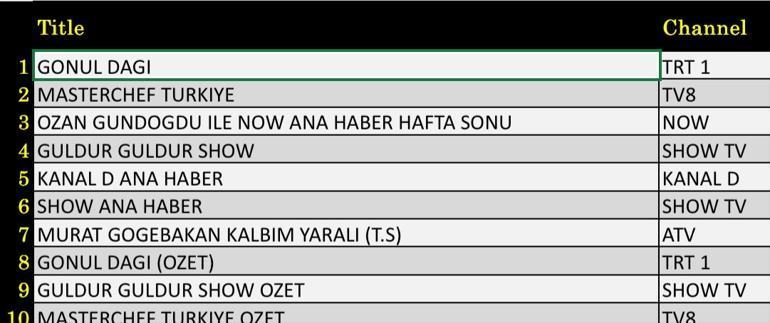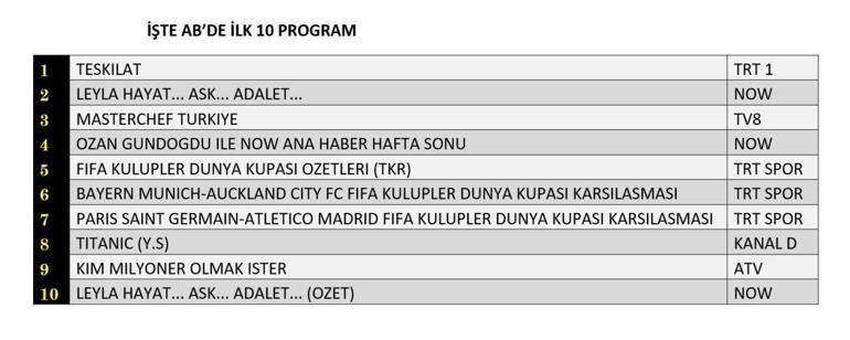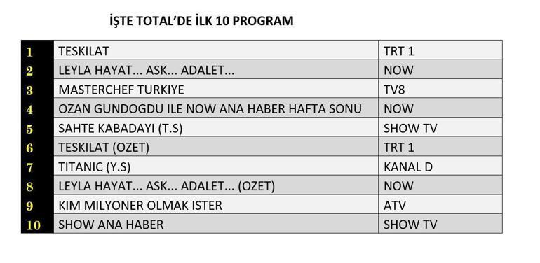 Değerlendirmenin sonuçları, halkın merakıdır. 15 Haziran Pazar değerlendirmesinin sonuçlarının duyurulmasıyla yapım, dizi ve en çok izlenen filmler açıklandı. Dün gece kim milyoner olmak ister?, Titanic, Leyla: Hayat … Aşk … Adalet, Toplu Yanlış, Berlin Tiger, Organizasyon, MasterChef Türkiye Derecelendirme Sonuçlar soruşturma altında. İşte 15 Haziran Pazar değerlendirmesinin sonuçları …