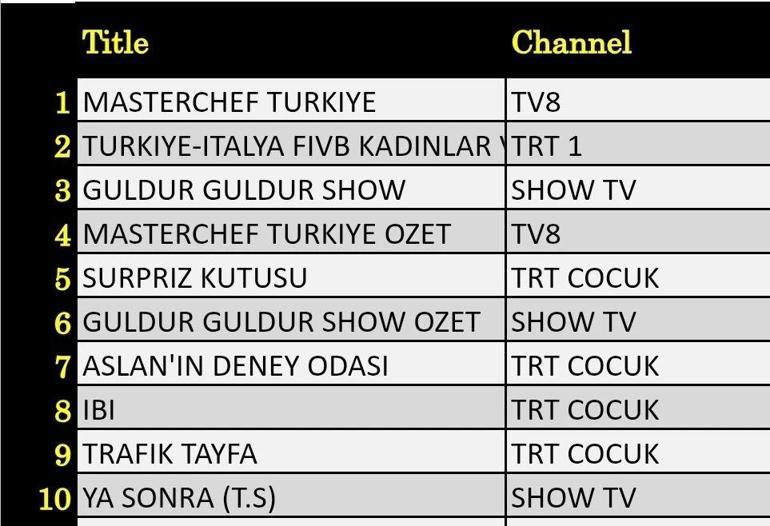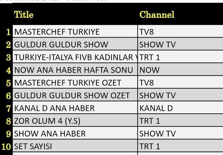 Kuzey’in Oğlu Volkan Konak , Madalyon, MasterChef Türkiye, Yalancı Yarim, Güldür Güldür, 2025 Voleybol Kadınlar Milletler Ligi Türkiye-İtalya, Biricik Sevgilim gecenin reyting birincisi kim oldu?
