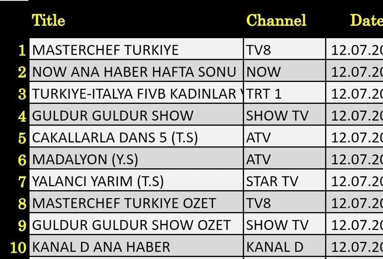 Değerlendirmenin sonuçları, halkın merakıdır. 12 Temmuz değerlendirme sonuçlarının duyurulmasıyla yapım, dizi ve en çok görüntülenen filmler açıklandı. Dün gece, Kuzey Volkan Konak, Madalyon, Masterchef Türkiye, Liar Yarim, Güllür Gülür, 2025 Voleybol Kadın Milletleri Ligi “Türkiye-İtalya” nın oğlu, tek değerlendirme sonuçlarım soruşturma altında. İşte 12 Temmuz Cumartesi değerlendirilmesinin sonuçları …