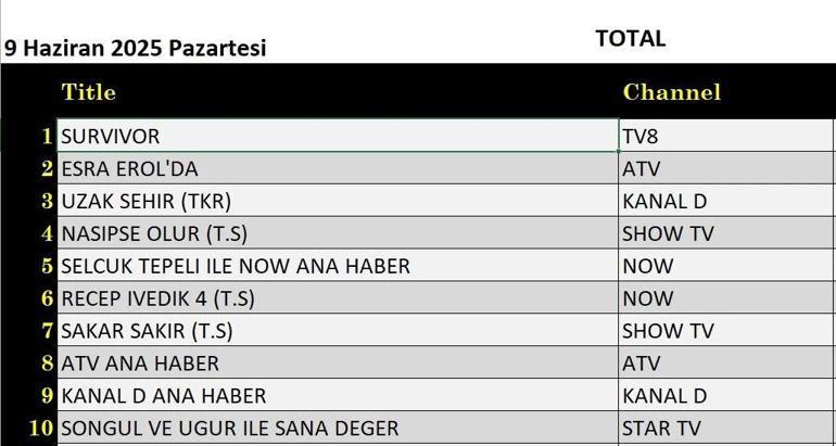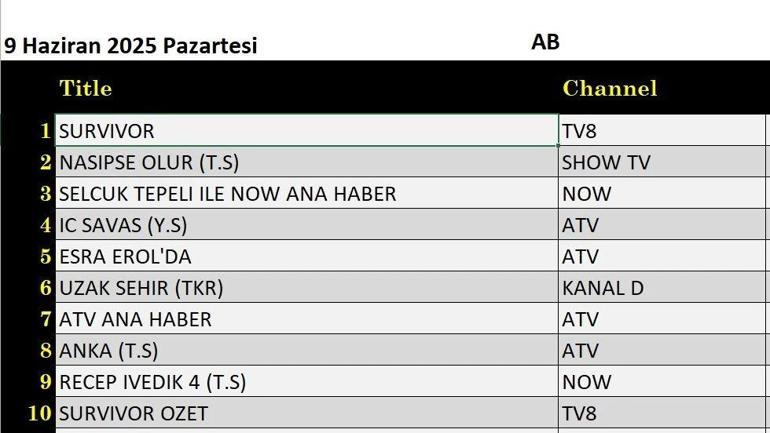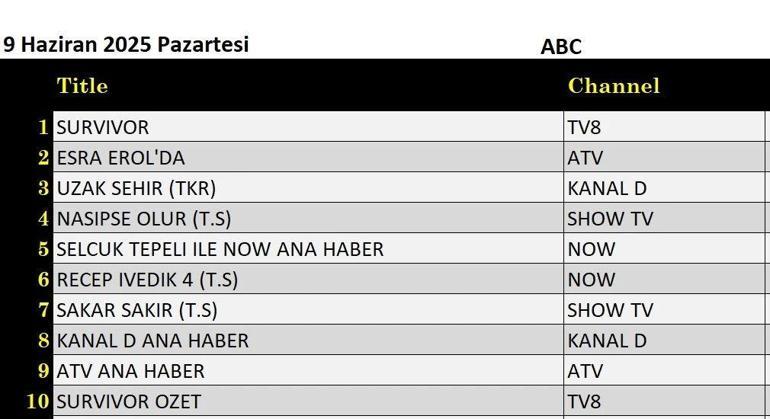 9 Haziran Pazartesi günü değerlendirmenin sonuçları açıklandı. 9 Haziran Pazartesi günü TV8’de yayınlanan Survivor, tüm kategorilere ilk kez geldi.